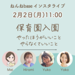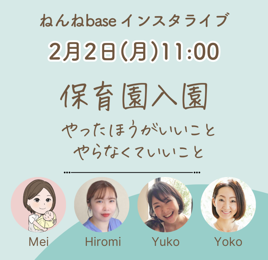 インスタライブのお知らせ(2月2日 11:00) 投稿日 2026年1月29日 著者 ねんねbase カテゴリー お知らせ 2026年2月2日 11時より、ねんねのプロ4名でインスタライブを開催します。 テーマ:保育園入園 ー やったほうがいいこと、やらなくていいこと、その他心構えなどねんねのプロ:西脇ひろみ、鴨田芽依、中山ゆうこ、ゆいなだ陽子 Instagramのアカウントはこちら - シェア - ツイート - LINE - コピー ネントレ ねんねコンサル ねんね改善 ねんね相談 乳幼児睡眠コンサルタント 夜泣き 寝かしつけ